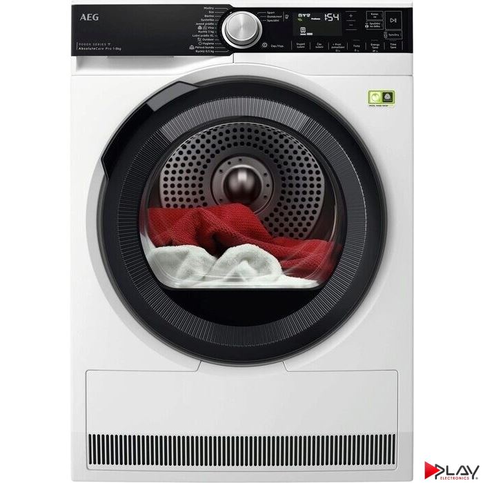 Sušička bielizne AEG AbsoluteCare® Plus 9000, Systém FiberPro s technológiou 3DScan meria vlhkosť vo vnútri odevov a podľa toho upravuje dĺžku sušenia, Hlavné technológie: AbsoluteCare® Plus, En. trieda: A, Kapacita sušenia (kg): 8, Spôsob sušenia: Tepelné čerpadlo, Hlučnosť (db): 60, Vnútorné osvetlenie bubna, nemusíte vopred triediť bielizeň podľa typov tkanín - program MixDry+ usuší až 5 kg zmesi bavlny a syntetiky za 75 minút* v režime Time Save, Pomocou aplikácie My AEG Care môžete prispôsobiť nastavenia a získať inteligentné tipy a návrhy, Program Hygiene certifikovaný spoločnosťou Swissatest pri teplote nad 60 °C počas sušenia odevy dezinfikuje, pričom odstraňuje 99,9 % baktérií a vírusov, Rozmery V x Š x H x H max. (mm): 850 x 596 x 657, Invertor motor so zárukou 10 rokov, Štandardné vybavenie: Odpadová sada na odvod kondenzátu, Český panel a popisky, záruka 5 rokov na celý spotrebič po registrácii