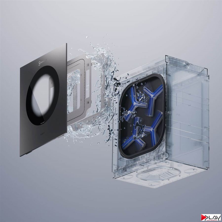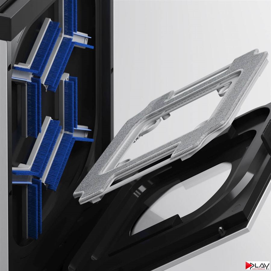 Už žiadne dotýkanie sa špinavých čistiacich handričiek alebo ich ručné pranie! Vďaka technológii Vortex Wash budú dôkladne opraté už za 1 minútu. Šestnásť vysokotlakových trysiek vo vnútri stanice poskytuje nepretržitý a cielený prúd vody s tlakom 20 kPa. Voda preniká hlboko do vlákien handričky, rozpúšťa a uvoľňuje odolné škvrny. Štyri čistiace kotúče, ktoré sa otáčajú rýchlosťou 200 ot./min a sú vybavené hustými štetinami, stláčajú a drhnú každé vlákno handričky. Tým napodobňujú pohyb a tlak pri ručnom praní. Nakoniec gumené stierky odstránia špinavú vodu a vyžmýkajú prebytočnú vlhkosť. Zároveň handričku ponechajú optimálne vlhkú pre ďalšie čistenie bez šmúh. Celý proces prania je rýchly a pohodlný, handričky zostanú vždy čisté a pripravené na použitie.