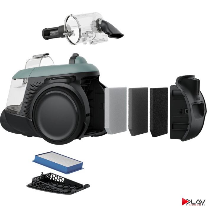 Bezvreckový vysávač Electrolux, hlučnosť 74 dB, kovová teleskopická trubica, objem nádoby na prach: 1,6 l, akčný rádius 9 m, integrované parkovacie pozície, mäkké kolieska, regulácia výkonu, filtračný systém HEPA je schopný odfiltrovať až 99,99 %* častíc jemného prachu, roztočov a alergénov o veľkosti iba 0,3 mikrónu, a zaistiť tak čistejší vzduch v domácnosti, hubica na čalúnenie, farba: Ocean Green