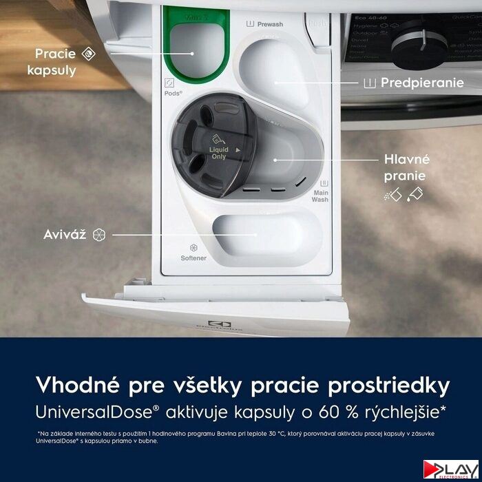 Práčka hlboká spredu plnená Electrolux, náplň bielizne: 8 kg, maximálna rýchlosť odstreďovania: 1400 ot./min, veľký LED displej, Pracie programy: bavlna, jemná bielizeň, Duvet, Eco 40-60, Hygiene, športová bielizeň, QuickCare 69 min., Rapid 20 Min, plákanie, odstredenie/vypustenie, Sportwear, para osvieženie, syntetika, wool\silk , WiFi konektivita, UniversalDose® – optimalizované pre všetky pracie prostriedky vrátane pracích kapsúl, SteamRefresh – osvieženie bielizne parou, hlučnosť 72 dB, rozmery (V x Š x H - H max.) mm: 847 x 597 x 576-599, motor ÖKOInvertor so zárukou 10 rokov, 5 rokov záruka na celý spotrebič po registrácii