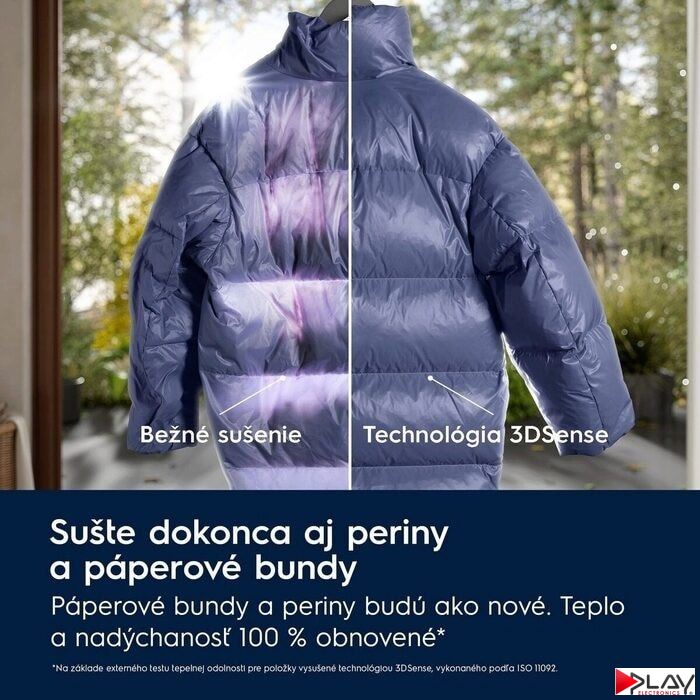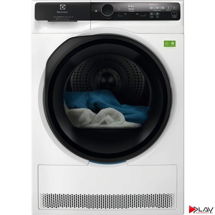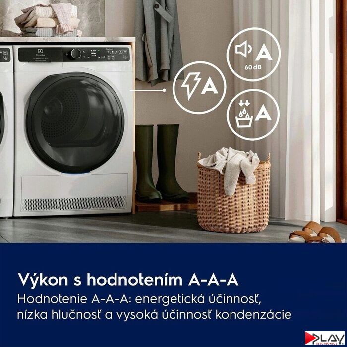 ElectroluxSušička s tepelným čerpadlom 800 UltraCare, kapacita sušičky (kg): 9.0, spotreba energie na 100 cyklov (kWh): 79, energetická trieda A, objem bubna 118 l, vnútorné osvetlenie, technológia 3DSense – páperové bundy a periny ako nové, ukazovateľ fázy programu sušenia: ochrana proti pokrčeniu, fáza chladenia, suchá na uloženie, sušenie, extra sušenie, suchá na žehlenie, ďalšie ukazovatele: filter, nádrž, kondenzátor, kapacita kondenzačnej nádržky 5,56 l, hlučnosť 60 dB, Program MixCare+ vysuší naraz až 5 kg zmesi bavlny a syntetiky, a to už za 75 minút bez potreby triedenia, stačí na ovládacom paneli zvoliť režim Time Save, rozmery (v x š x h - max. h) mm: 850 x 596 x 659, rozšírená záruka 10 rokov na motor Invertor, 5 rokov záruka na celý spotrebič po registrácii
