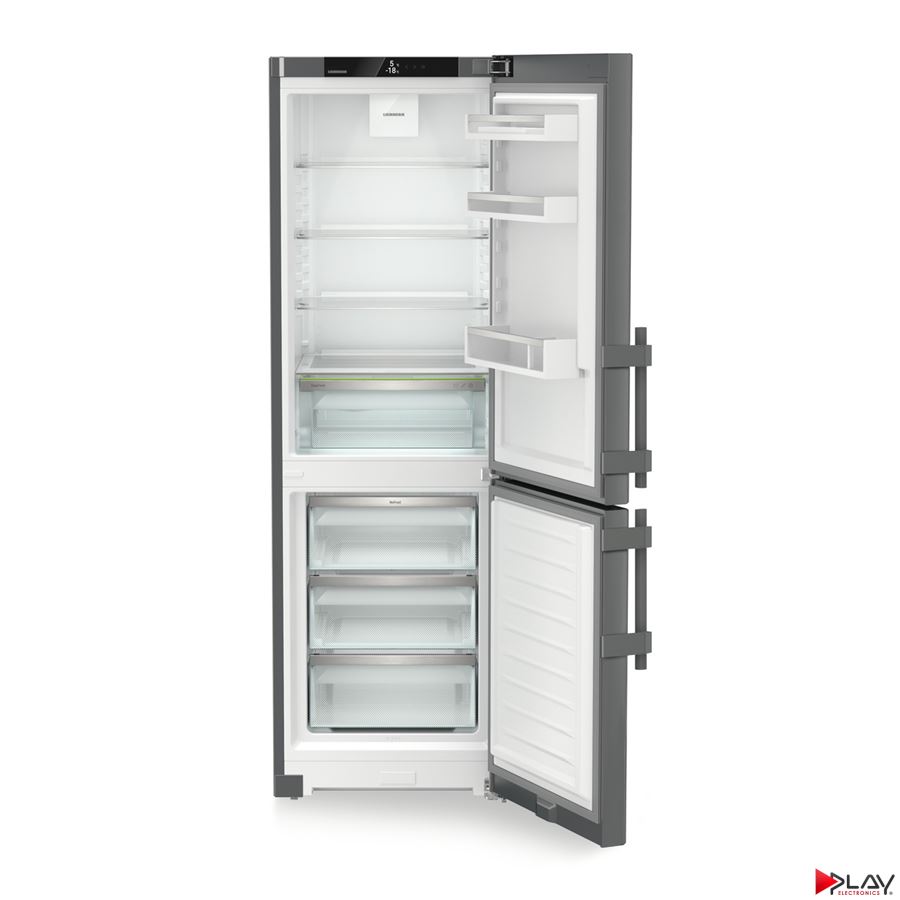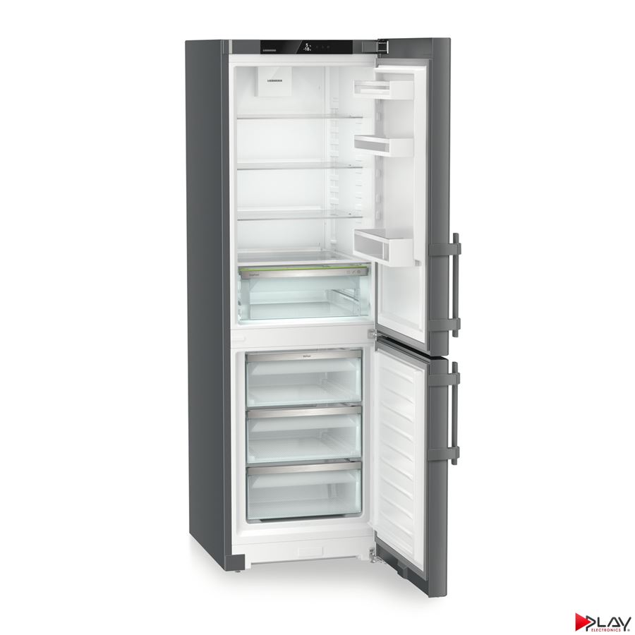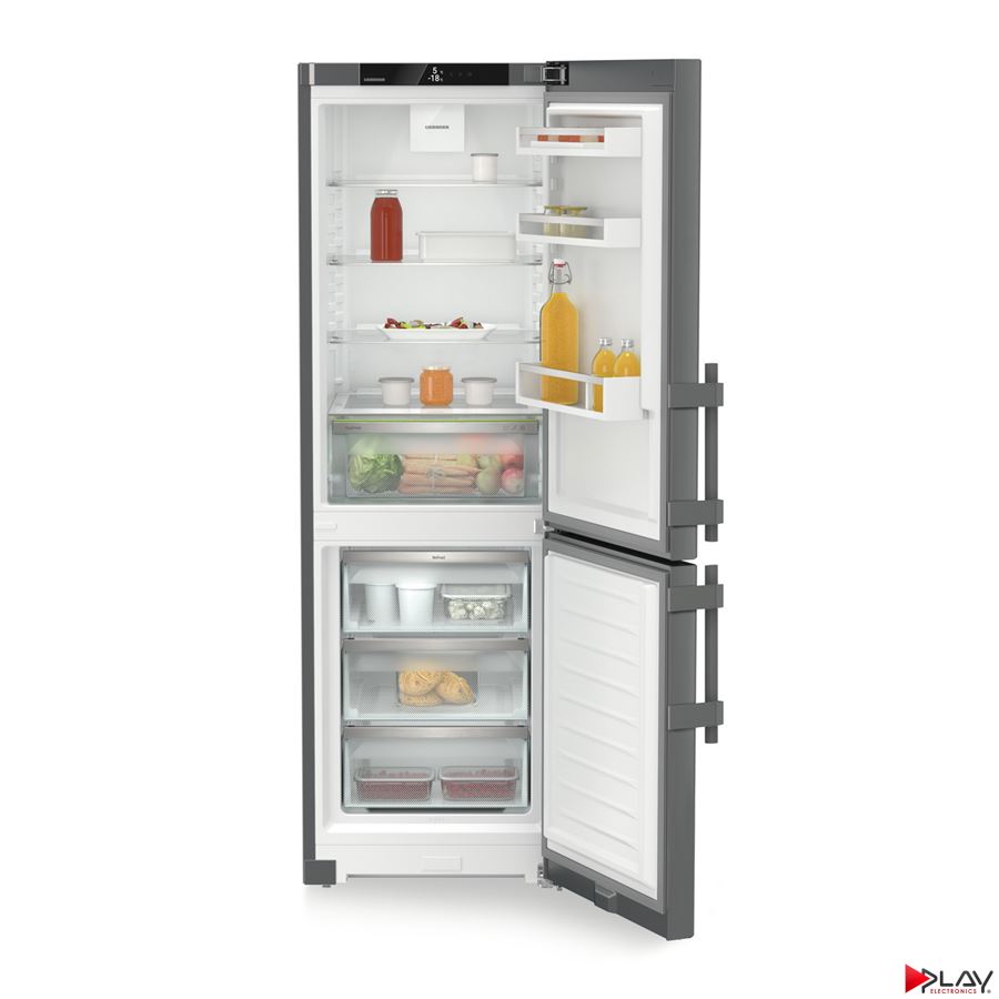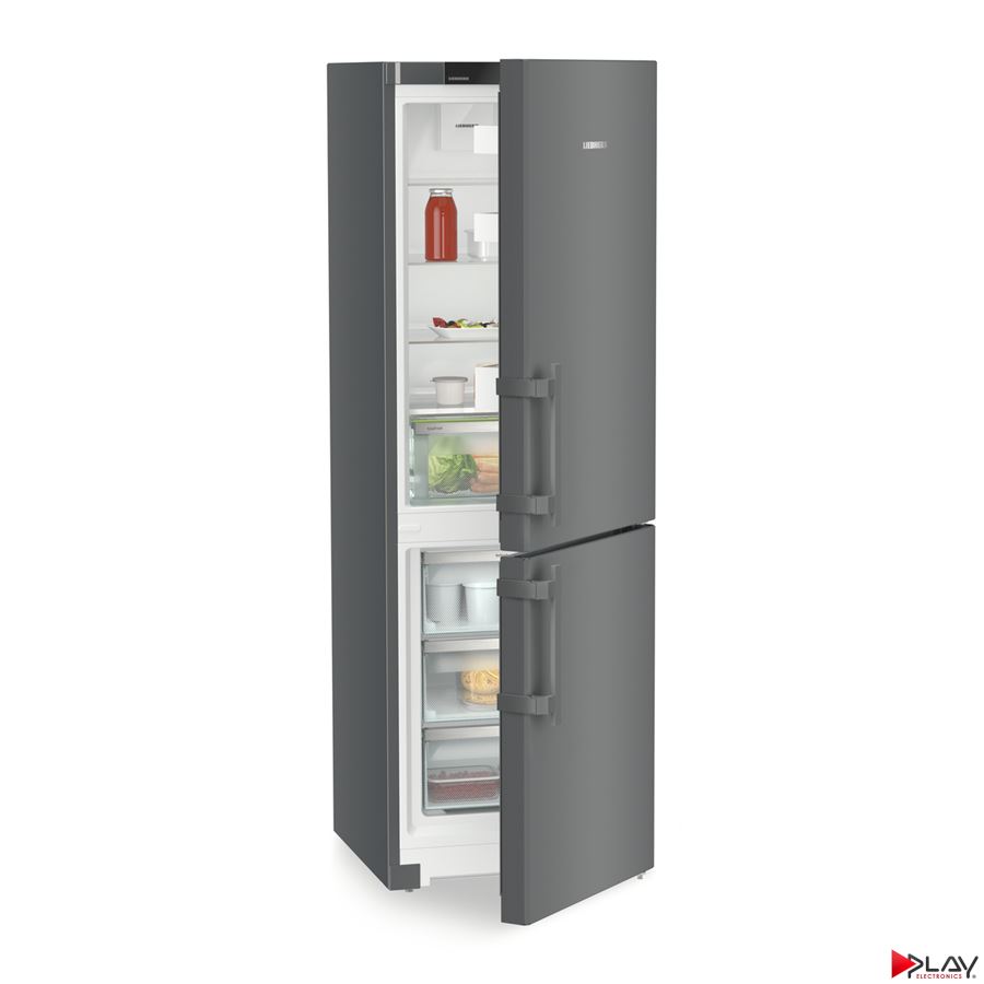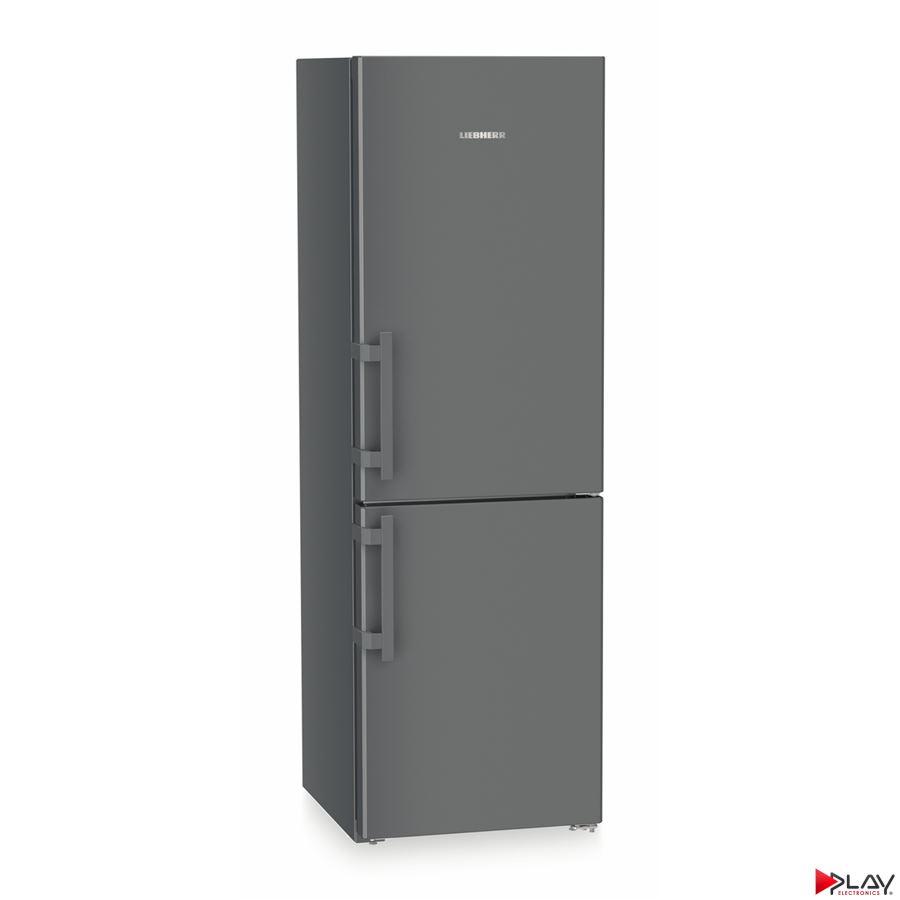 Kombinovaná chladnička LIEBHERR, objem 330l (227/103), energetická trieda C, denná spotreba energie 0,441 kWh/24 h, EasyFresh, NoFrost, DuoCooling, stropné LED osvetlenie, monochromatický LC displej za dverami, elektronické dotykové ovládanie, madlo s integrovanou mechanikou otvárania, mraziaca kapacita 10 kg/24 h, doba skladovania pri poruche 20 hod., hlučnosť 35 dB, FreshAir filter s aktívnym uhlím, dverový a teplotný alarm, rozmery v cm ( VxŠxH ) : 185,5 x 59,7 x 67,5, farba: DarkGrey