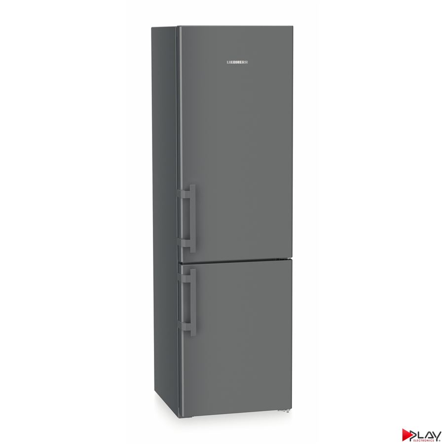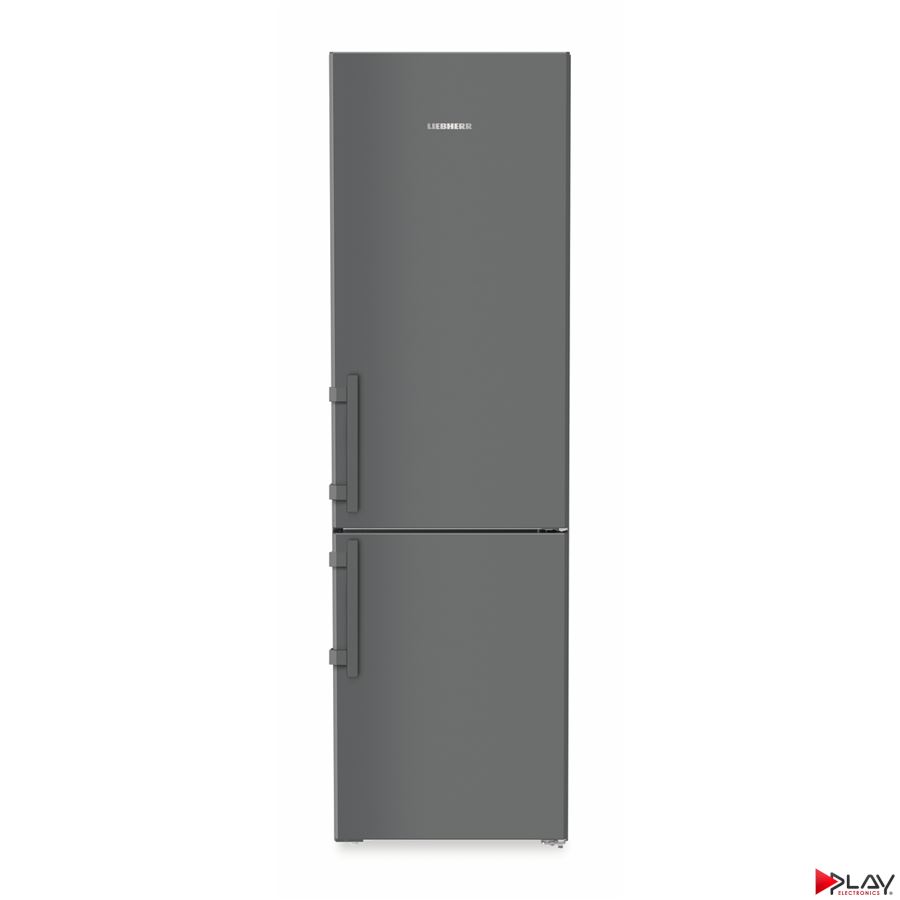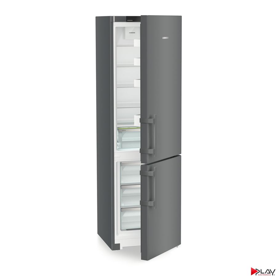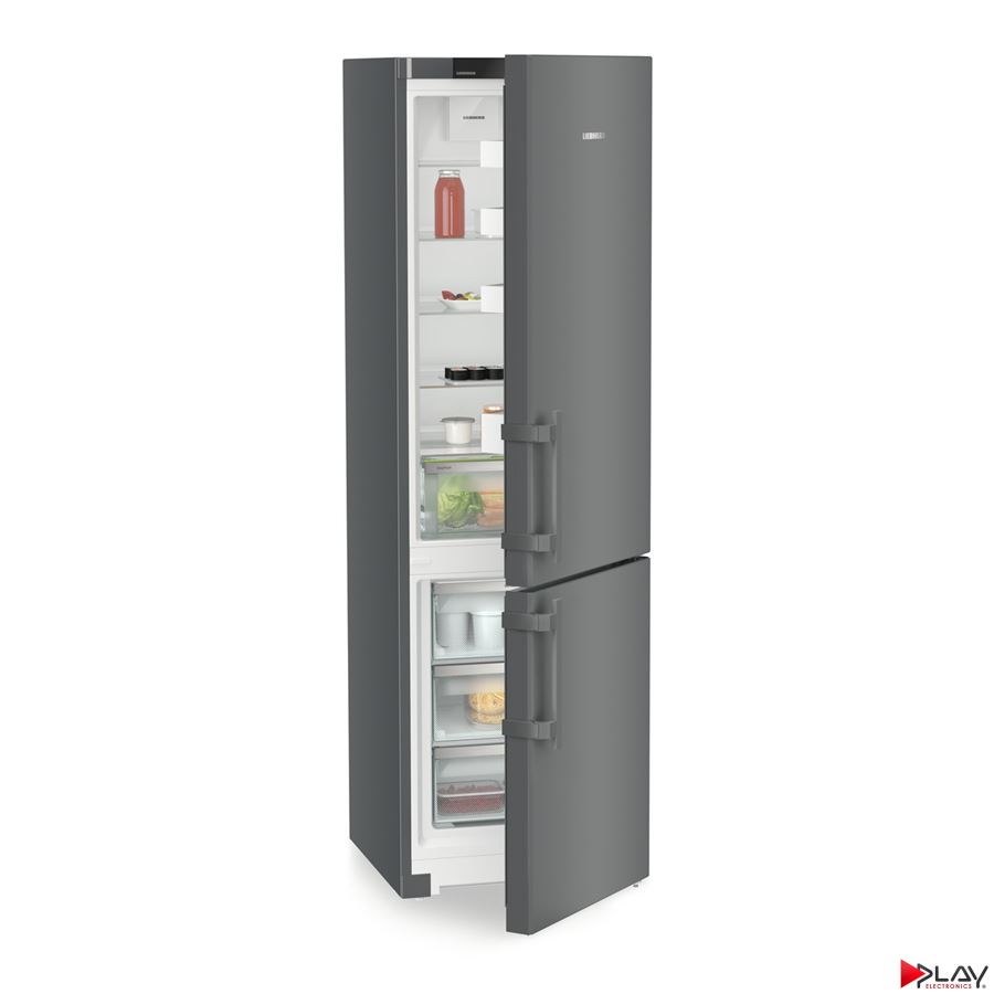 Kombinovaná chladnička LIEBHERR, objem 371l (268/103), energetická trieda C, denná spotreba energie 0,443 kWh/24 h, EasyFresh, NoFrost, DuoCooling, stropné LED osvetlenie, monochromatický LC displej za dverami, elektronické dotykové ovládanie, madlo s integrovanou mechanikou otvárania, mraziaca kapacita 10 kg/24 h, doba skladovania pri poruche 20 hod., hlučnosť 35 dB, FreshAir filter s aktívnym uhlím, dverový a teplotný alarm, rozmery v cm ( VxŠxH ) : 201,5 x 59,7 x 67,5, farba: DarkGrey