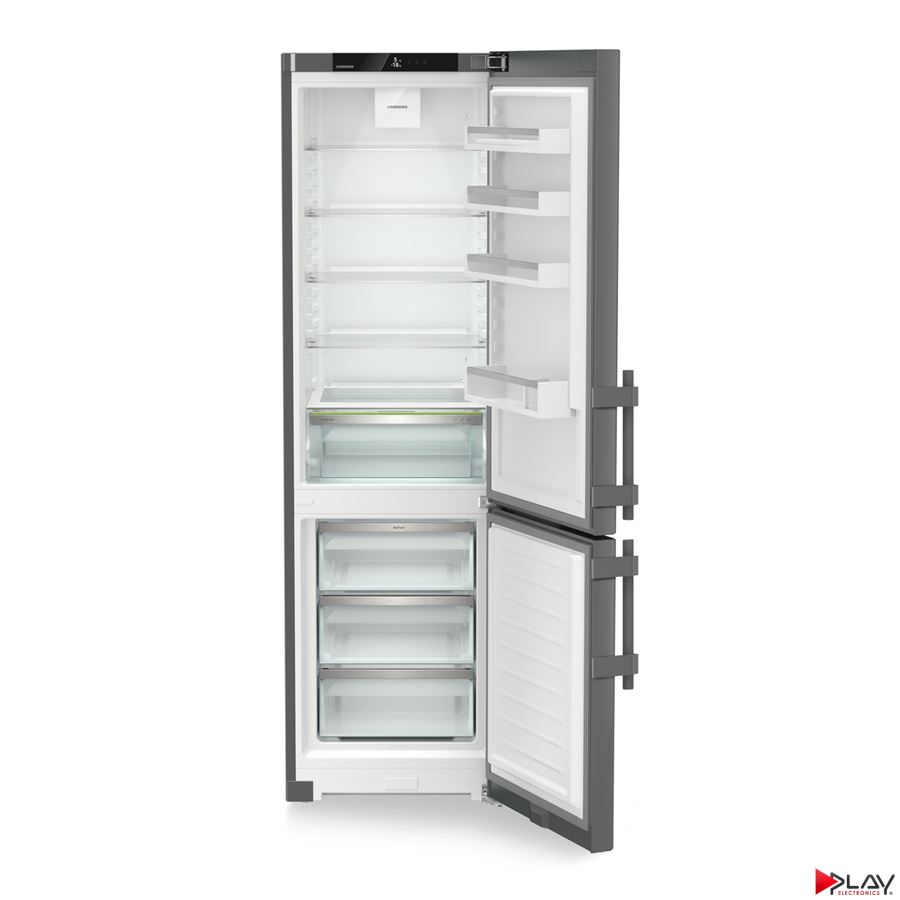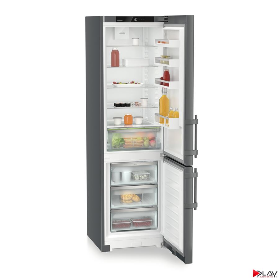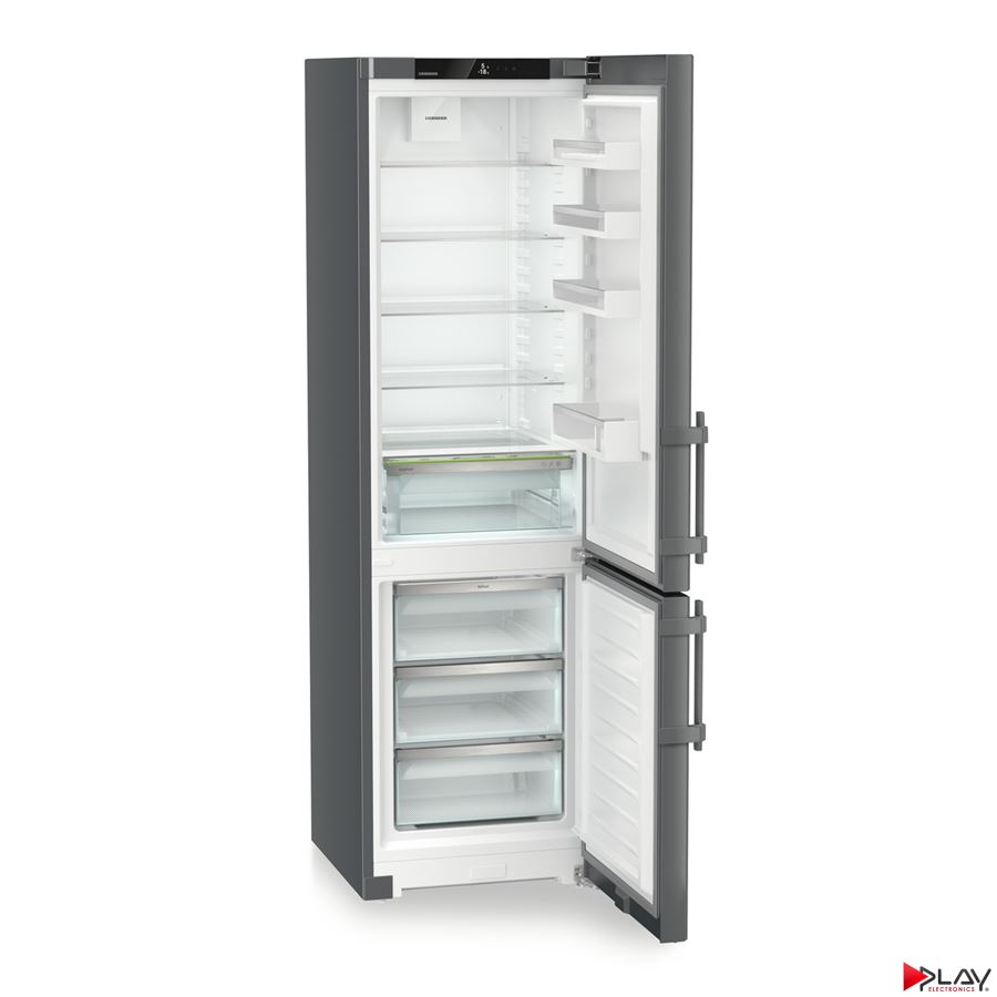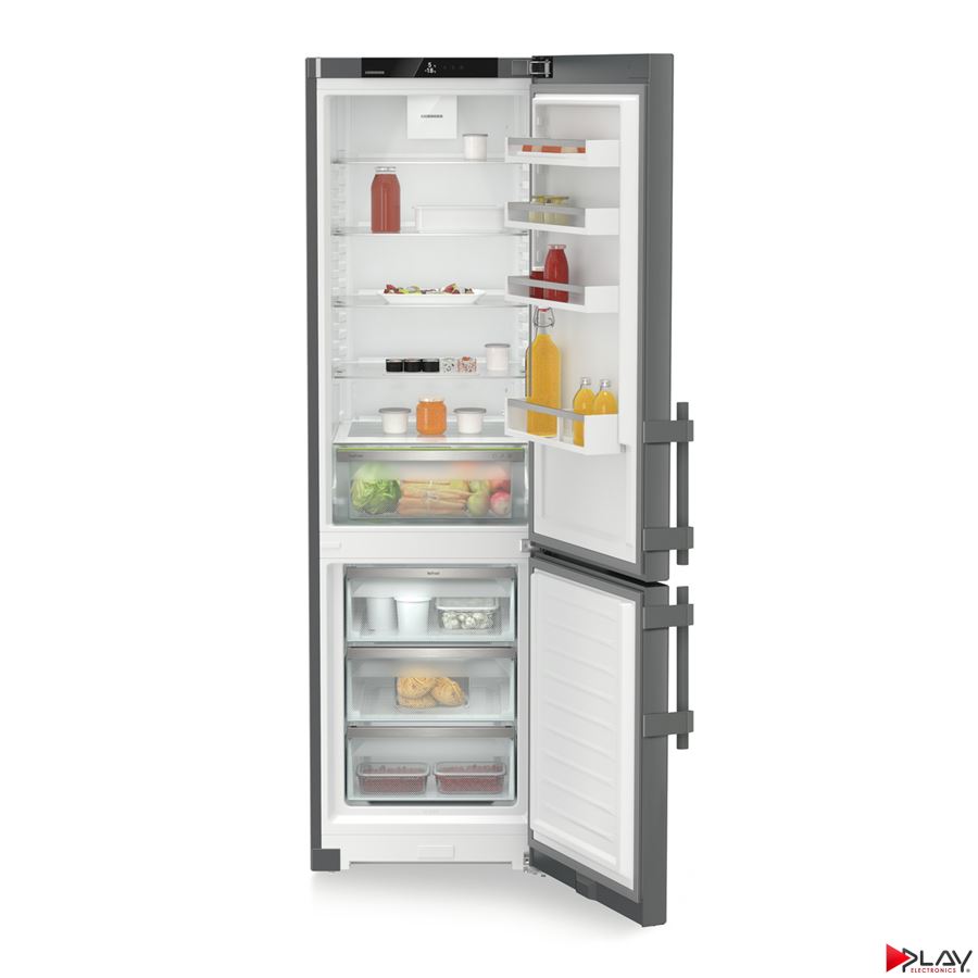 Kombinovaná chladnička LIEBHERR, objem 371l (268/103), energetická trieda C, denná spotreba energie 0,443 kWh/24 h, EasyFresh, NoFrost, DuoCooling, stropné LED osvetlenie, monochromatický LC displej za dverami, elektronické dotykové ovládanie, madlo s integrovanou mechanikou otvárania, mraziaca kapacita 10 kg/24 h, doba skladovania pri poruche 20 hod., hlučnosť 35 dB, FreshAir filter s aktívnym uhlím, dverový a teplotný alarm, rozmery v cm ( VxŠxH ) : 201,5 x 59,7 x 67,5, farba: DarkGrey
