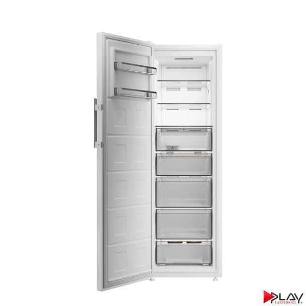 Skriňová mraznička 286 l, energ.tr. E (250 kWh/rok), hlučnosť 34 dB (B), vonkajší displej, 5 zásuviek, 3 police, 2 balkóniky vo dverách, LED osvetlenie, Rýchle mrazenie, teplotný alarm, vxšxh: 186,5 x 60 x 71 cm, farba: biela, vyčnievajúca rukoväť, 10 rokov záruka na kompresor